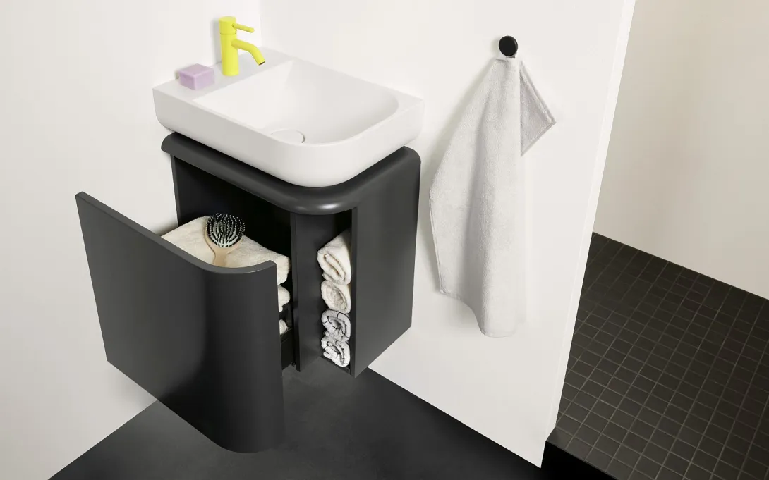 Für Gästebäder ist bei b:me eine Ecklösung vorgesehen, wodurch die Armatur seitlich auf dem Waschtisch platziert und das Becken etwas tiefer dimensioniert werden kann. Die Abmessungen sind dabei insgesamt großzügiger als üblich, was auch für den Unterschrank gilt, der dadurch mehr Stauraum bietet. So wird die Gästebad-Lösung auch interessant für kleinste urbane Bäder oder Tiny Houses.