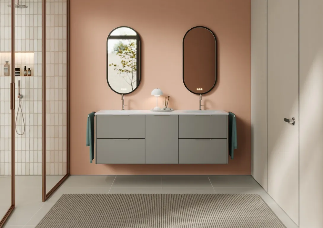 Oteo wurde gezielt auch für kleinere Räume entwickelt und entfaltet gerade dort seine Wirkung. Die Serie bietet eine durchdachte Lösung für kompakte Badezimmer und kombiniert platzsparende Planung mit einem auffälligen Designcharakter.