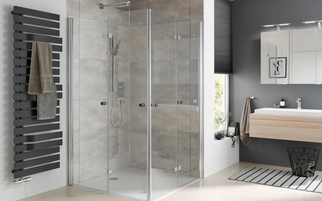 Die Kabinen bieten flexible Türlösungen, wie Drehfalttüren oder Schiebetüren, die einen großzügigen Zugang ermöglichen und somit auch in kleineren Bädern optimal genutzt werden können.