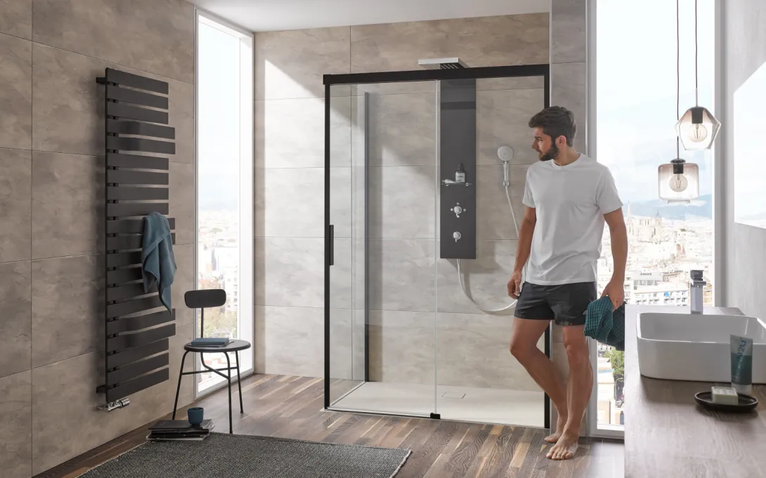 Mit 8 mm starkem Sicherheitsglas und minimalistischem Design verleihen die Duschkabinen dem Bad eine moderne und elegante Atmosphäre. Zudem sind sie in trendigen Farben wie Schwarz-matt verfügbar.