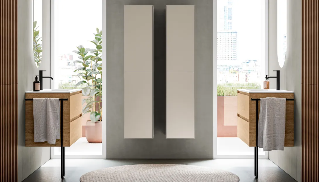 #46 steht für ein durchdachtes Design, das Qualität auf den Punkt bringt. Die optimierte Tiefe der Schränke eignet sich ideal für mittelgroße Badezimmer und bietet zugleich Stabilität und großzügigen Stauraum.