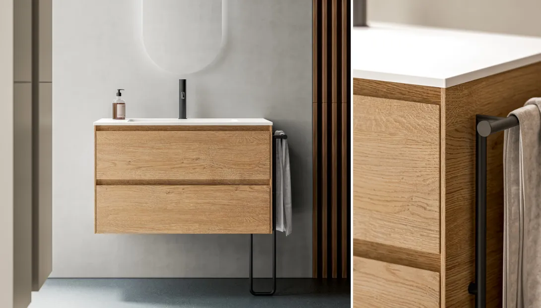 Ein schlankes Seitenprofil zeichnet eine feine Kontur entlang des Schranks und verleiht der Kollektion ihre unverwechselbare Signatur. In Kombination mit hohen Waschtischen oder Waschtischplatten aus Keramik, Ceramilux oder Mineralmarmo entsteht ein stimmiges Gesamtbild mit hohem funktionalem Anspruch.